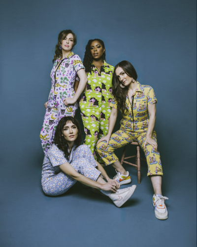 song in colorful jumpsuits with the backdrop of a studio fit for a